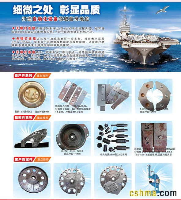 公司由多位长期从事机械行业高级技术人员组成。生产气液增压缸式冲压设备,开发无铆钉连接模具,供应数控冲床模具,对外机械加工,经销数控类切削刀具、刀架、刀片、搪刀、车刀、五金工具。标准化,系列化,多元化,非标准设计制造