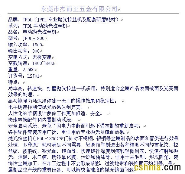 ----手提式拉丝机、手提式抛光机、不锈钢抛光机、不锈钢拉丝机、电动抛光机、电动拉丝机、速控抛光机、调速拉丝机 JPDL-1800电动抛光拉丝机热销中-[JPDL]东莞市杰而正五金有限公司,以:高效,实用,品质为本,针对不锈钢焊接后的修复,划痕,小面积拉丝,抛亮,及凹凸不平面,弧面,钣金,内角位等打磨,拉丝处理的好工具!适用于钣金机箱机柜,不锈钢装饰工程,厨具设备厨房设备工程,电器电机电气设备,机械设备,不锈钢金属材料,医疗器械设备,家具木材业等等方面的表面处理打磨,抛光(粗抛,精抛),拉丝,修复,去除毛刺等等。 JPDL抛光拉丝机-让您的产品表面更漂亮;为各界的钣金生产提供完美的升级,创造更高的价值! QQ: 2271952273